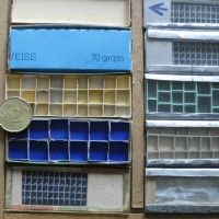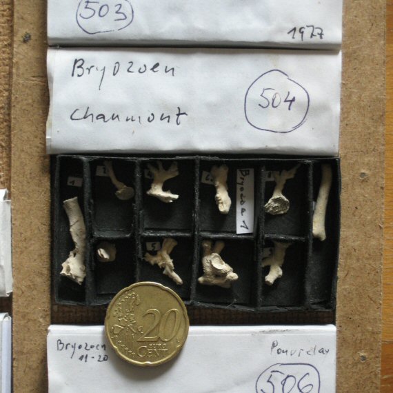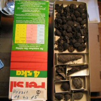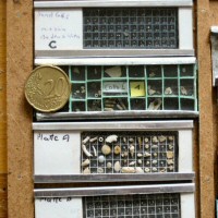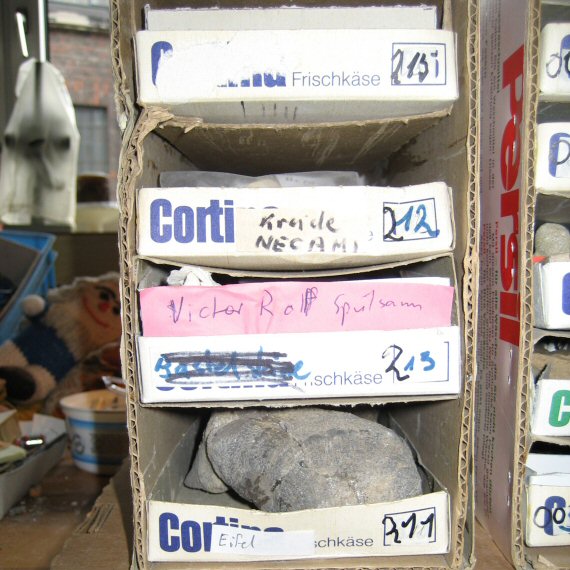 Da wurden aus alten Waschmittelpackungen und div. Kartonagen hunderte Schachteln, passgenau für die darin verwahrten Fossilien gebastelt. Die kleinsten davon sind Behältnisse in der Größe 10 x 10 mm mit drei mm hohem Rand. Diese sind exakt zu 2-4 Stück in die nächst größere Sammelschachtel eingepasst.