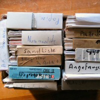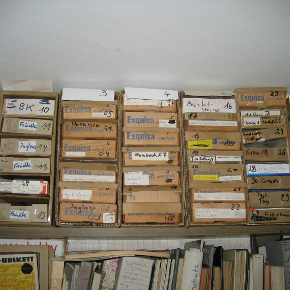 Der Erfindungsreichtum und der Wissensdurst dieses Menschen sind beachtlich! Oder kennt man sonst noch jemanden, der CD-Hüllen aus illustriertem Papier selber zusammenklebt? Jemanden, der Eierbrikett durchgesägt und angeschliffen hat um sich mit ihrem inneren Aufbau vertraut zu machen? Irgendwen, der seit über 80 Jahren seinen „Fossilium Catalogus“ nach Nummern, nach Fundorten, nach Fossilnamen und Erdzeitaltern incl. aller Querverweise führt? Muss ich an dieser Stelle noch erwähnen, dass diese Karteien ausnahmslos handgeschrieben und zu selbstgebundenen Heften zusammengestellt sind?