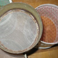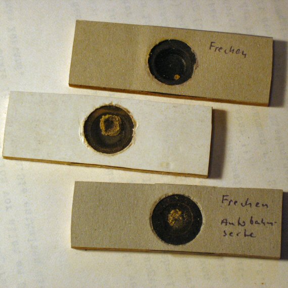 Herr Köditz kurbelt sein Polyphon an, legt eine seiner Lieblingsmessingscheiben auf und erzählt. Erzählt, wie er die unterschiedlichen Siebgrößen in Plastikbecher eingeklebt hat, Orangennetzbeutel als gröbste Fraktion und dann immer feiner abgestuft. Bis hinunter zu 0,1 (in Worten nullkommaeins) mm. Weiß jemand eine Quelle für Siebe mit 0,1mm Maschenweite? H. Köditz hat sich dieses spezielle Format vor ewigen Zeiten in der Dürener Papierfabrik besorgt!