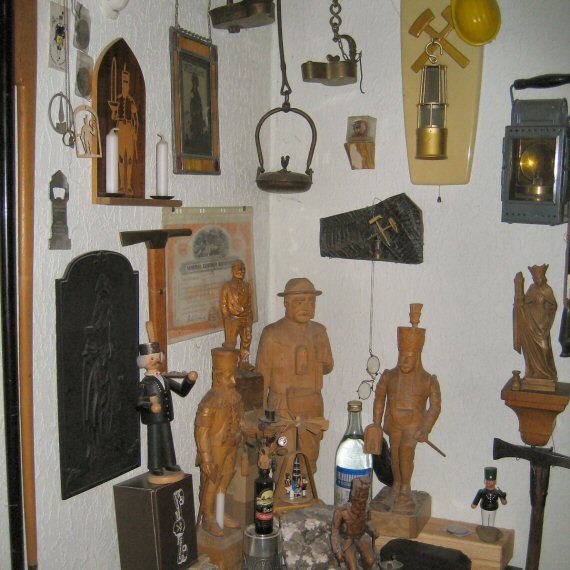 In der Wohnung des Ehepaares Köditz fällt neben den geologischen Hobbys sofort auf, dass ein weiteres Interessensgebiet die Bergbaugeschichte des Erzgebirges ist und die Beiden nach wie vor tief in ihrer ostdeutschen Heimat verwurzelt sind. Eine große Anzahl erzgebirgischer Schnitzereien, uralter Reifentiere, seltener Bergbauerinnerungsstücke, sowie eine großartige Seifener Bergparade zeugen davon.