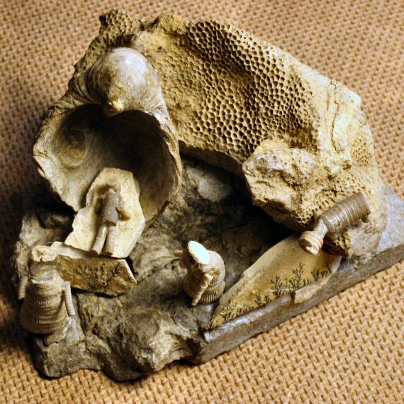 eine Krippe aus Fossilien des Eifeldevons, mit einem ca. 1,5 cm großen Jesuskind