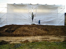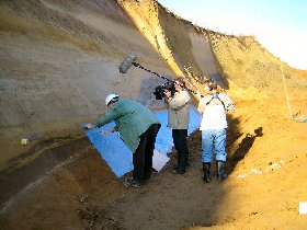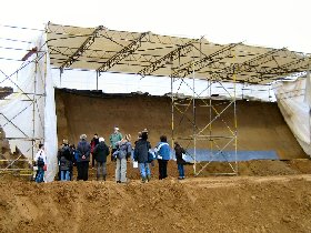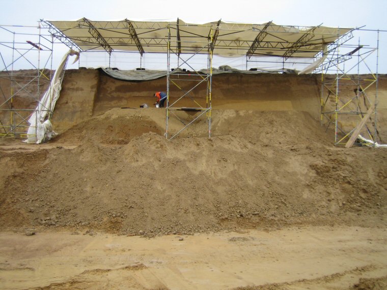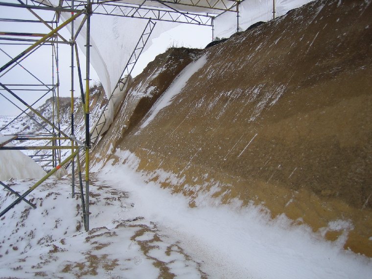 Zum Schutz des Profils vor der nasskalten Witterung der kommenden Wochen hat uns die Tagebauleitung ein Schutzdach spendiert! So konnten wir, außer bei Frost, wetterunabhängig arbeiten. Die ganze Gerüstkonstruktion war schon aus zwei Kilometern Entfernung zu sehen und manch ein Besucher des Tagebau-Aussichtspunktes südl. der Gemeinde Jüchen fühlte sich an ein Werk von Christo und Jeanne-Claude erinnert. Diesen Anblick hätte sich sicher kein Neandertaler erträumt - und wir vor einigen Wochen auch noch nicht. | |