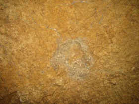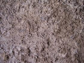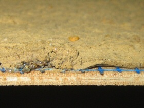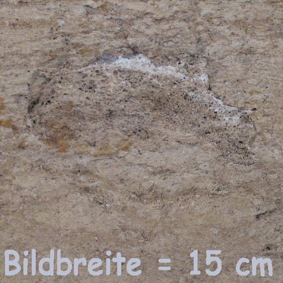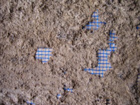| Endlich ging es weiter. Nachdem die tonnenschweren Eisblöcke auf dem Gerüstdach sich endlich wieder in Regenwasser verwandelt hatten, konnten wir die sechste Reihe des Großprojektes in Angriff nehmen. Beim Abziehen aus der Wand zeigte sich auf Kachel Nr. 64 (Foto siehe im Gesamtbild) eine etwa Handteller große wabenartige Struktur, die uns sofort an das Innenleben eines Knochen erinnerte! Sollte das nun doch noch ein archäologisch interessanter Fund sein? Eine abschließende Bewertung des Stücks steht z. Zt. noch aus. | ||