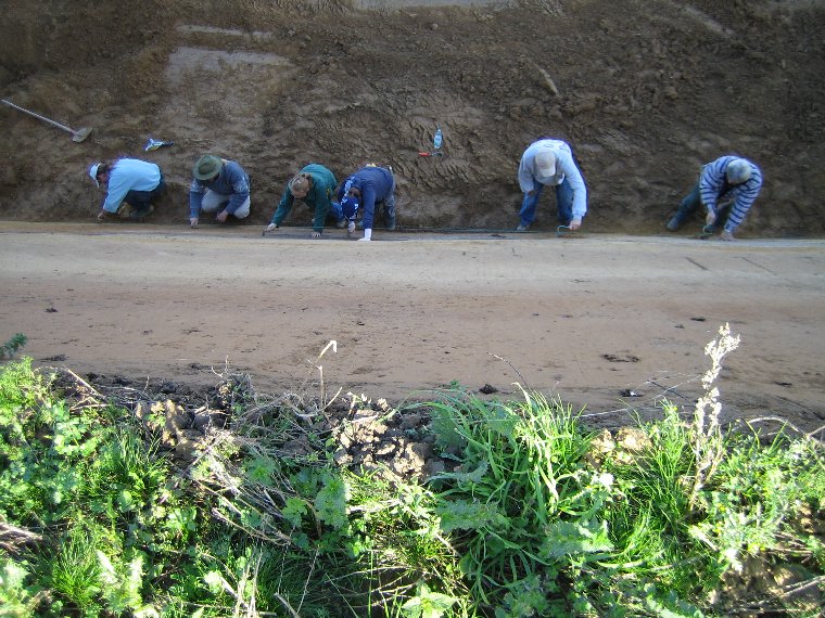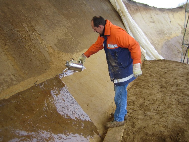 Wir hatten uns entschieden, das Gesamtprojekt in 8 Reihen zu 1 m Höhe und 12 m Länge zu unterteilen. Vor dem Lackauftrag musste die vom Bagger erstellte Fläche leicht aufgerauht werden, um Feinstrukturen detailliert wiederzugeben und um die Kontaktfläche des Lacks zum Boden zu vergrößern. Für diesen Arbeitsschritt benötigten die Grabungsprofis des LVR ca. 1 - 2 Std. Von oben betrachtet erschien uns die Wand noch größer und steiler als vom Böschungsfuß her gesehen. Nachdem der Lack aufgetragen war, musste eine erste Trocknungszeit von ca. 24 St. eingehalten werden. | |