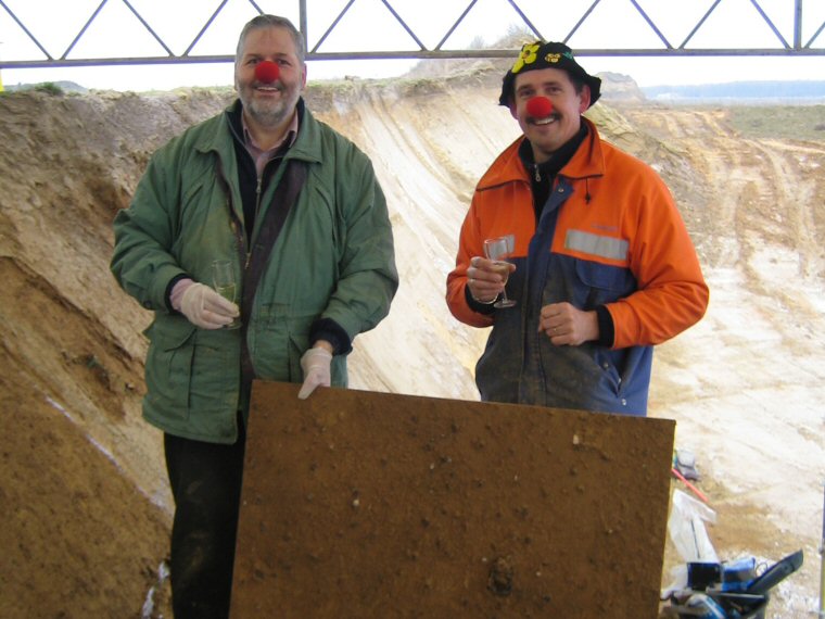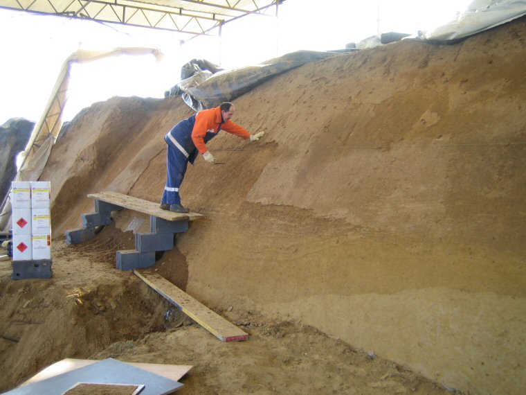 Startschuss war das Freilegen der gesamten Arbeitsböschung durch einen Baustellenbagger. In einem Winkel von ca. 60° zur Horizontalen wurde die Böschung möglichst glatt abgezogen und zum ersten Mal wurde die gesamte Fläche in ihrer ganzen Aussagekraft sichtbar. Nach einer Besprechung mit dem Rheinischen Landesmuseum Bonn wurde dann unten links der Anfangspunkt des Lackabzugs festgelegt und in der folgenden Woche sollten die ersten Arbeiten beginnen. Hierzu waren der WDR Köln und ein Fotograf der RWE Power Presseabteilung eingeladen. | |