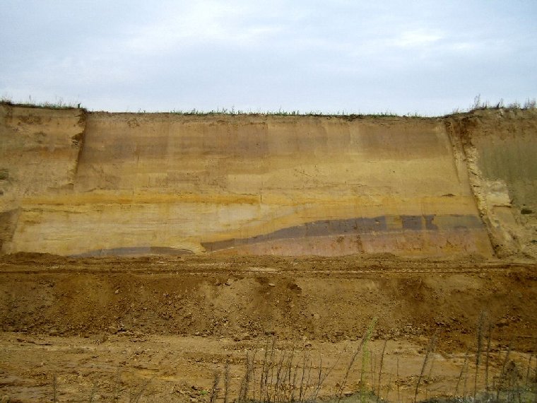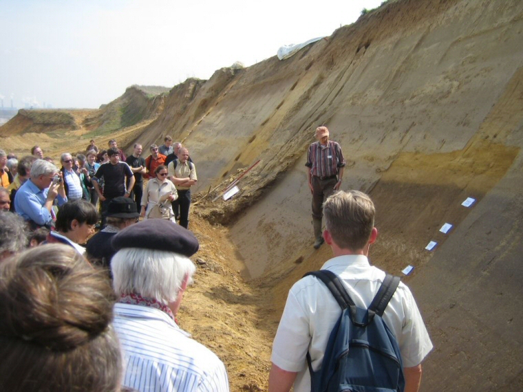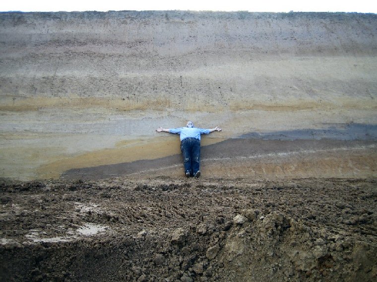 Eine Woche später haben wir uns, zusammen mit einem Bodenkundler der Uni-Düsseldorf und dem Grabungsteam der Außenstelle Titz des Landschaft Verbands Rheinland (LVR), vor Ort getroffen und uns die vom Schaufelradbagger freigelegte Böschung auf der 1. Sohle im Nordfeld des Tagebaus Garzweiler angeschaut. Eigentliches Objekt der Begierde war das dunkelbraune Band eines eemzeitlichen Bodens, der auf ca. 117.000 Jahre datiert ist. In der Frühzeit des Neandertalers war diese Schicht die Geländeoberfläche und im Laufe der vergangenen Jahrtausende hat sich darüber eine etwa 8m mächtige Sedimentschicht abgelagert.