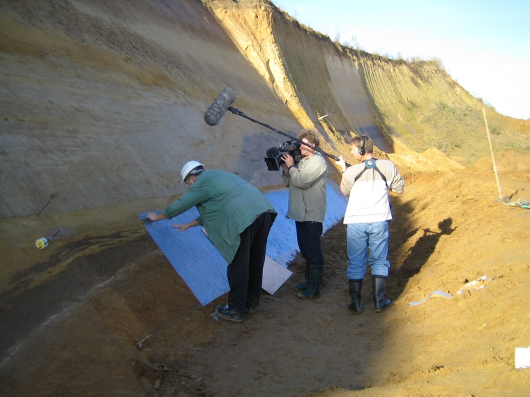 | Der große Moment! Unter den kritischen Augen eines WDR-Kamerateams, des Rheinischen Landesmuseums Bonn und der RWE Power Presseabteilung wurde am nächsten Tag der 1. Lackabzug aus der Böschung gelöst. Bis zu diesem Moment hatten auch wir keine exakte Vorstellung vom Aussehen des fertigen Stücks. Da der Lack in die einzelnen Bodenschichten und Feinstrukturen unterschiedlich tief eindringt, ist es immer wieder eine Überraschung, wie profiliert die Sedimente wiedergegeben werden. Die gehärtete Bodenschicht des Gesamtprofils hat beim fertigen Lackabzug eine Dicke von 2 bis 35 mm. | ||