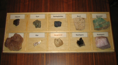 Die Stücke werden auf einem entsprechend eingeteilten Holzbrett präsentiert, um der Lehrerin einen schnellen Überblick über event. Verluste zu ermöglichen. Zum pfleglichen Umgang mit den Exponaten trägt auch die Benennung eines Schülers zum "Mineralienbeauftragten" bei.