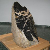 Außerhalb der Vitrine ist ein anpolierter Driftblock aus der Hauptterrasse der 1. Sohle zu sehen und ein großes Stammstück von Taxodioxylon gypsaceum zu sehen.